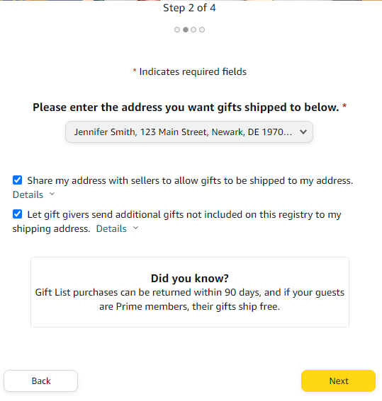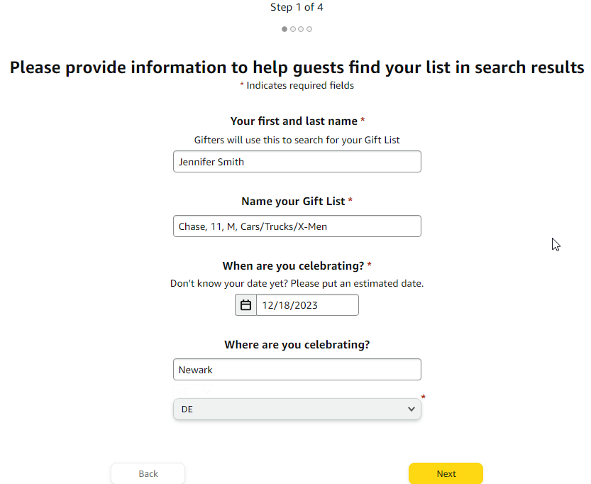 When completed, please email me the link to each gift list. You can add items to your gift lists afterwards.