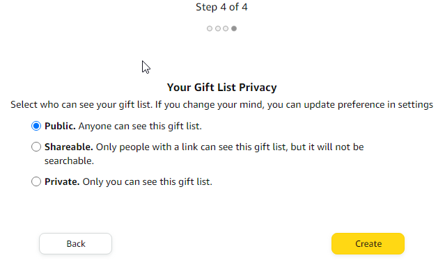 For Step 4, choose Public or Shareable. I recommend Public, so individuals within your sponsoring department can find your gift list if they don’t have immediate access to your gift list link.